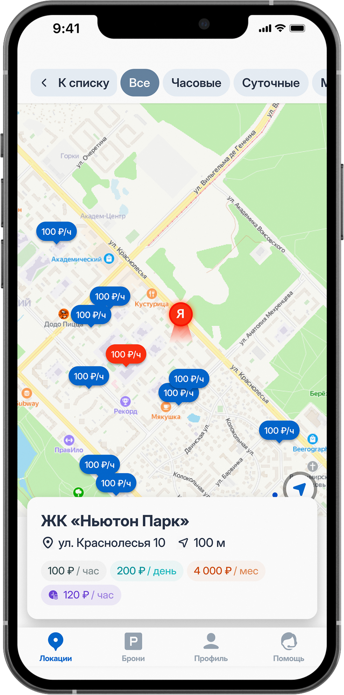 • Посмотреть тарифы и свободные места • Проверить парковки поблизости • Забронировать и оплатить паркинг • Получить напоминание о том, что оплаченное время паркинга заканчивается